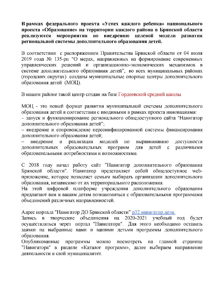 Информационный портал Навигатор – это онлайн-каталог и система бронирования кружков, курсов, секций всех муниципальных центров ДО в регионе, а также спортивных, музыкальных и художественных школ. Теперь записаться в них на обучение можно только через Навигатор https://р32.навигатор.дети/ нашего региона. С помощью нового сайта родители могут выбирать для своих детей занятия и курсы, исходя из тематики, местоположения центра, возрастной категории и т.д.